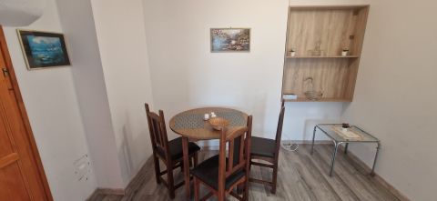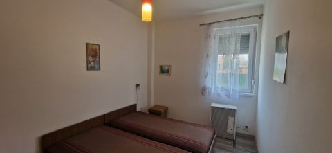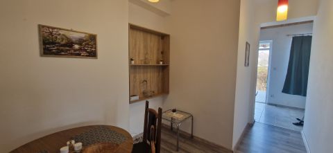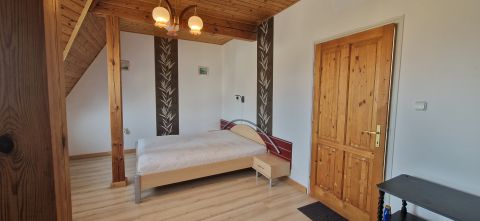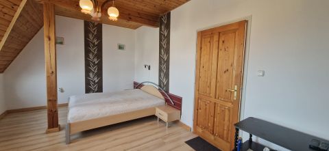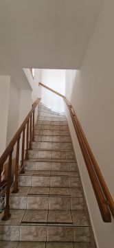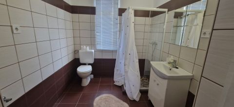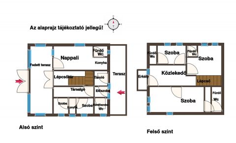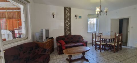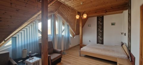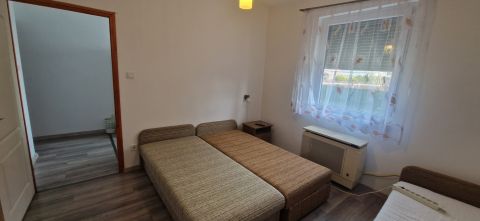 A földszinten található egy teljesen külön bejáratú lakrész, elosztása: előszoba, tároló, 2 szoba, társalgó, konyha, fürdőszoba wc- vel, terasz.