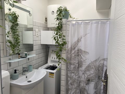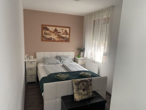 Szemben a Rózsa szigetben gyönyörködhetünk, 200 méterre a szabad strand található.