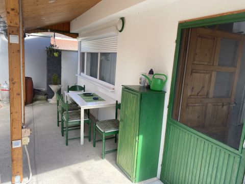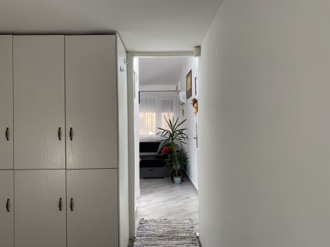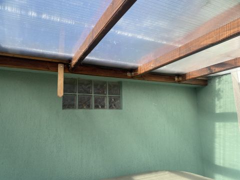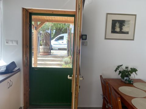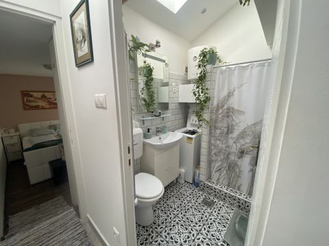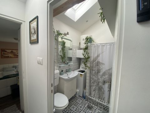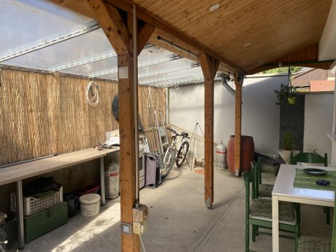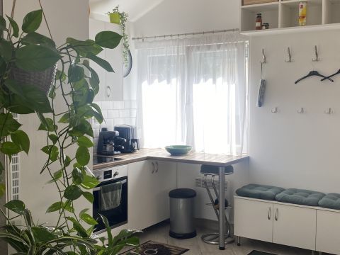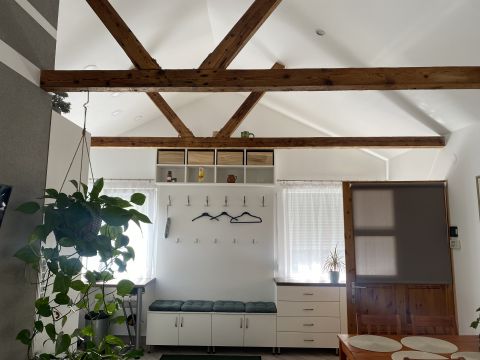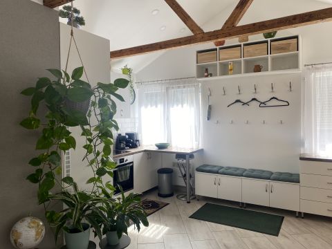 Félig polikarbonáttal és félig lambériával fedett teraszról ( nyári konyha) lépunk a világos modern dizájnal és nagy belmagassággal rendelkező amerikai konyhás nappaliba. Melyből nyílik a tető ablakkal ellátott, világos toalettes fürdő. Valamint a hangulatos hálószoba.