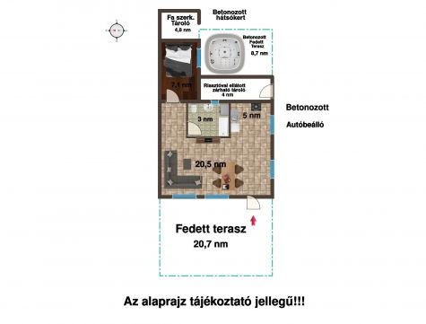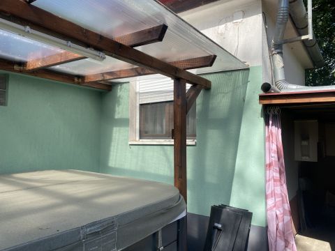 Az ingatlanból kilépve betonozott autóbeálló,tégla építésű, szigetelt, zárható, riasztóval ellátott tároló, a hátsó fedett terasz mely alatt a jakuzzi kapott helyet. És egy külső fa tároló is ki lett alakítva. A telek mögött pedig a Tassi Főcsatorna található.
