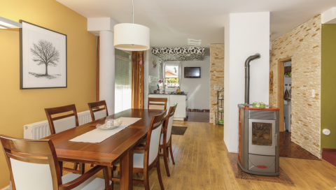 A ház fűtéséről egy Sanier Duval gáz cirkó kazán gondoskodik, valamint két Edil Kamin pellet tüzelésű kandalló is rendelkezésre áll. Alumínium redőnyök biztosítják a megfelelő árnyékolást a meleg, napsütéses hónapokban, ezen kívül a ház hűtése klímával megoldott.