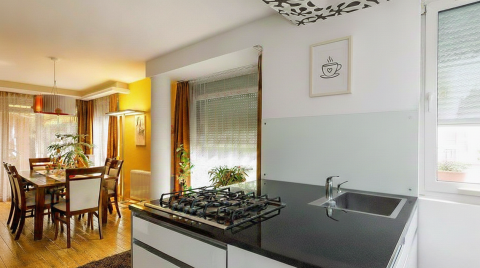 Földszinti, amerikai konyhás nappalija közvetlen kapcsolódik egy tágas teraszhoz, ahonnan kertje is megközelíthető, illetve a szinten található még egy fürdőszoba is. A ház emeleti részén 3 hálószoba, gardrób és zuhanyzós fürdőszoba került kialakításra.