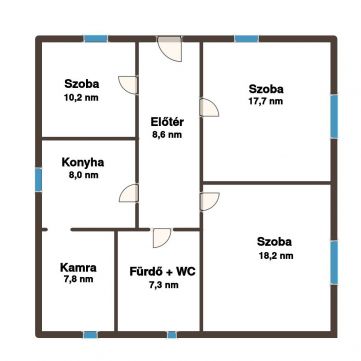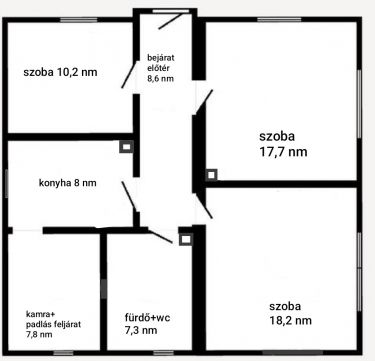 Elosztása praktikus: 3 világos szoba, tágas fürdőszoba, konyha, nagy kamra, valamint beépíthető tetőtér.