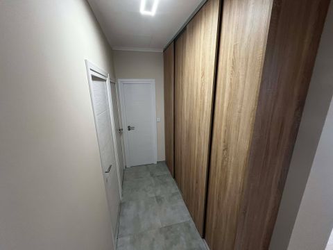 A folyosón mennyezetig érő, egyedileg beépített szekrény gondoskodik a maximális tárolásról és a letisztult megjelenésről.