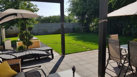 A DNy-i tájolású, frissen parkosított kert automata öntözőrendszerrel ellátott. A biztonságról riasztó- és kamerarendszer gondoskodik.