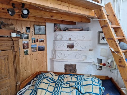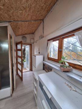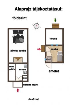 A földszinten az apró amerikai konyhás 12m2-es nappali fekvőgalériás. Tartozik hozzá egy 3m2-es fürdőszoba is wc-vel mosdóval és káddal. Pár lépcsőn a 24m2-es pincébe juthatunk, ami hálószobaként, tárolóként vagy buliszobaként is használható.