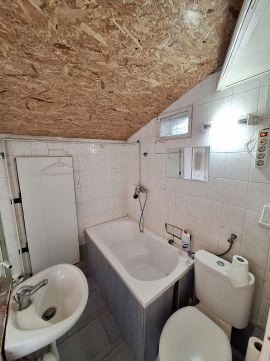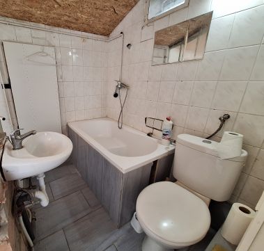 A fenti részen a 9m2-es szobához tartozik egy 3m2-es világos fürdőszoba, ahol kád, mosdó és wc is van.