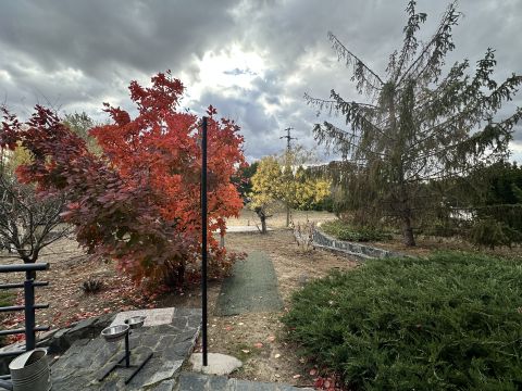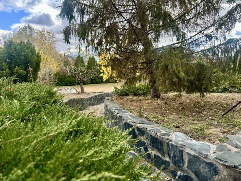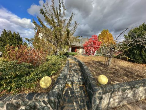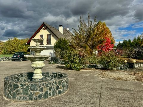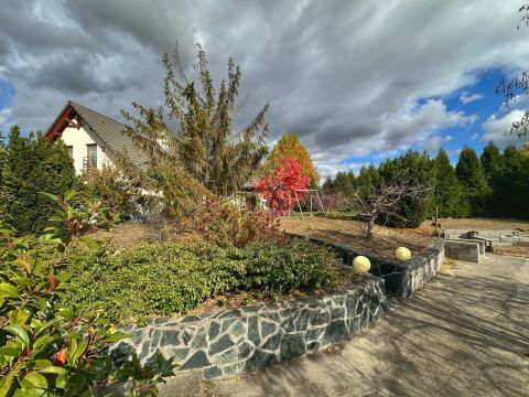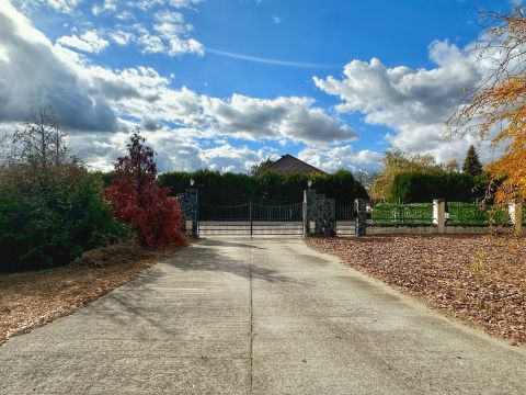 A ház betonút mellett, csendes, rendezett környezetben helyezkedik el, egy 2878 m²-es, parkosított telken, ahol a zöld növényzet, az öntözőrendszerrel gondozott kert és a tágas terek azonnal magával ragadják az embert.