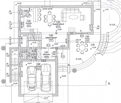 A földszinti lakótér (81 m²) központi eleme a napfényes nappali és étkező, amelyhez közvetlenül kapcsolódik a dupla garázs (34 m2), egy praktikus előtér és vendég toalett.
