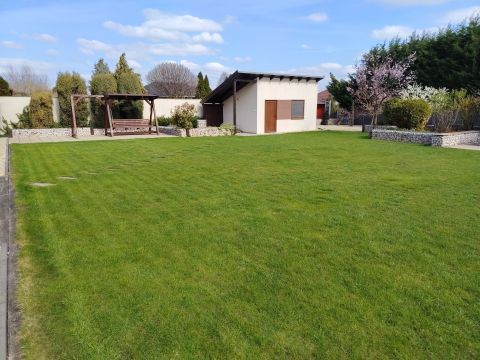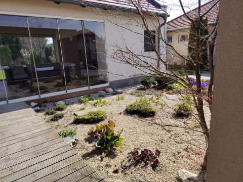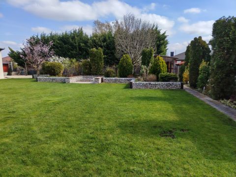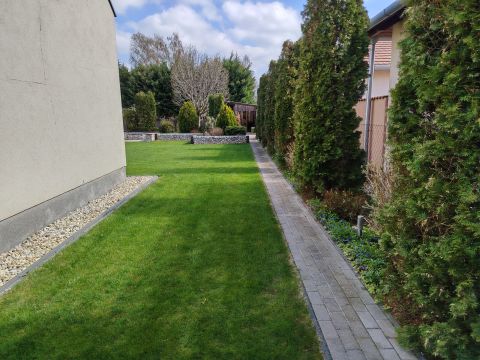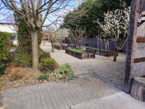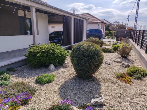 A kert gondozott,tágas,de helyett kapott 4 magaságyás,illetve gyümölcsfák,tárolóhelyiségek.