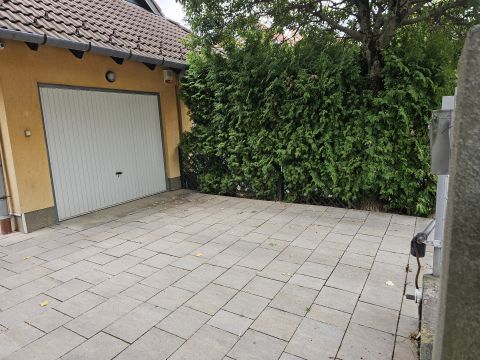 A házhoz 18 m²-es garázs tartozik, a garázs előtt pedig további beállási lehetőség biztosított.
