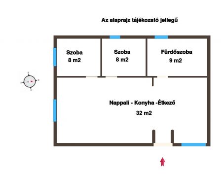 A 60 négyzetméter alapterületű ház egy 704 négyzetméteres telken található.