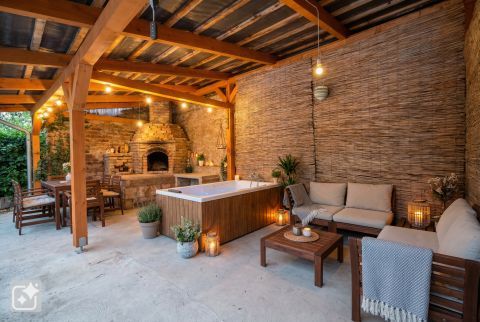 fedett terasz ahol már megkezdődött egy kemence kialakítása (AI kép)