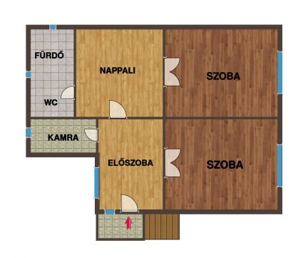 Jelenlegi elosztása szerit, 2 utcára néző nagy szoba, nappali ( ami akár konyhává alakítható ), előszoba, kamra, fürdő és wc alkotja a hasznos teret.