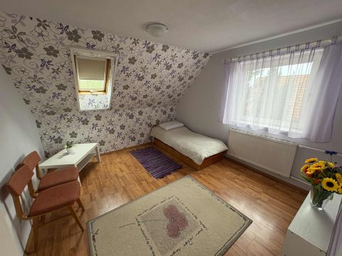 A belső elrendezése átgondolt és tágas: a tetőtérben két szoba, egy fürdőszoba WC-vel, valamint egy hatalmas nappali kapott helyet, míg a földszinten egy szintén nagy nappali, egy hálószoba, egy fürdőszoba, külön WC, egy kamra, valamint egy tágas konyha-étkező és a pincelejáró található. A pince szintén teljes értékűen hasznosítható, itt helyezkedik el a kocsibeálló, a kazánház a műhely és további tárolásra alkalmas helyiségek.