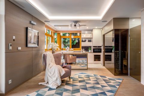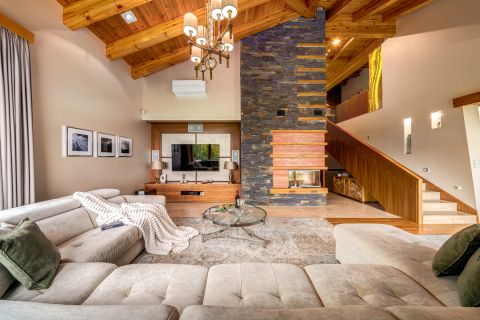 A ház szíve a tágas nappali, amelyet több mint 5 méteres belmagasság, elegáns kandalló és a lenyűgöző, örökpanorámás kilátás tesz igazán egyedivé.