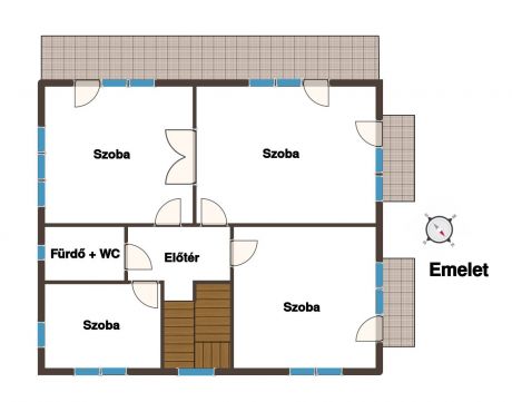 Felül 80 nm fűtött, itt négy külön nyíló szoba, előtér, fürdő+WC, illetve lépcsőtér