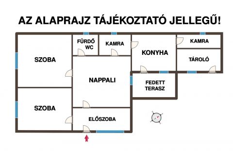 Helyiségeket tekintve kialakításra került 2 darab hálószoba, nappali, konyha étkezővel és kettő darab kamrával, fürdő WC-vel és egy előszoba.