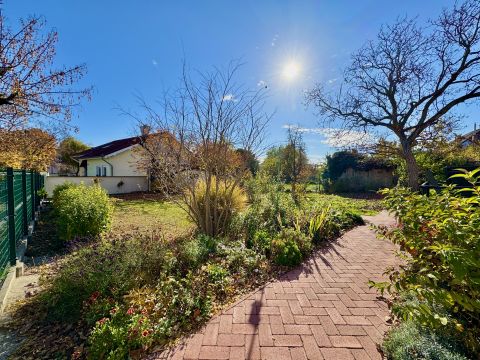 Gondosan karbantartott, 542 m²-es, összközműves, parkosított telek, viacolorral burkolt udvar, magaságyás, szikkasztóval ellátott esővíz-elvezetés