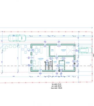 Földszinten: Tágas nappali+konyha étkező, zuhanyzó+wc, előtér, szoba, garázs 18.50 m2 , tároló, nyitott terasz.