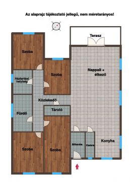 A ház 4 szoba + amerikai konyhás nappaliból, kamra, kádas fürdőszoba, külön zuhanyzós WC, és teraszból áll, ( A terasz nincs az alapterületben)