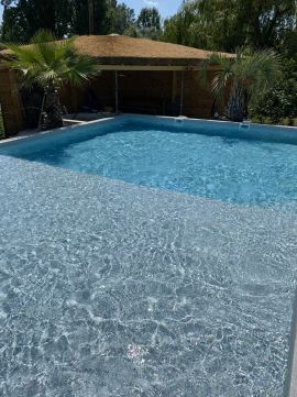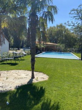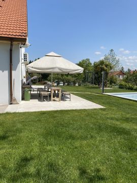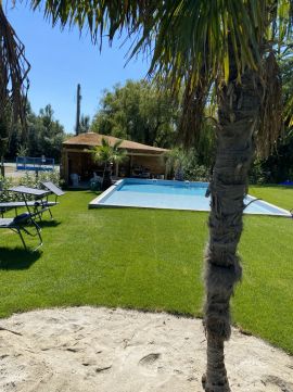 A gyönyörű telken rengeteg termő gyümölcsfa, pálmafák alatt mediterrán grillpavilon, tárolók, és egy 9*6 méteres medence is épült.