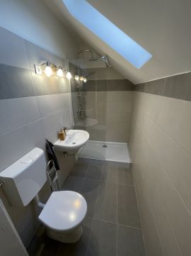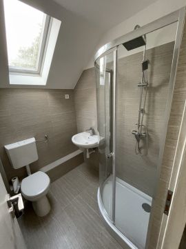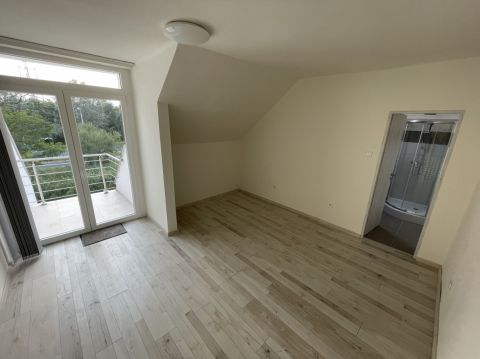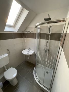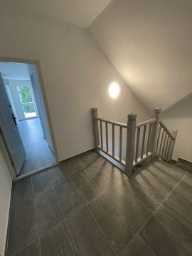 Az emeleti részben, 2 db 2 szobás, és 2 db 1 szobás lakóegység található, mindegyikben fürdőszoba és terasz kapcsolat elosztású.