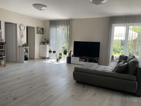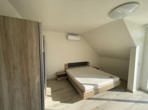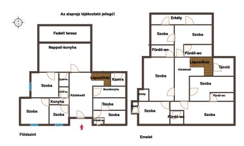 Az ingatlan elosztása, földszinten, tágas előszoba, világos amerikai konyhás nappali, ami a fedett teraszra nyílik, szoba, fürdőszoba-wc, tároló, mosókonyha, valamint 2 db 2 szobás lakóegységből álló lakrész amihez mindegyikhez saját fürdőszoba-wc, az egyikben konyha kialakítás is tartozik.