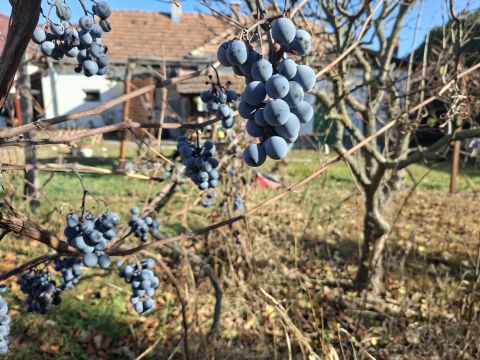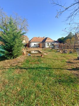 A kert rendezett, gyümölcsfákkal, szőlővel, virágokkal, nagy kerti halastóval, gyűrűs kúttal és tárolósátorral.