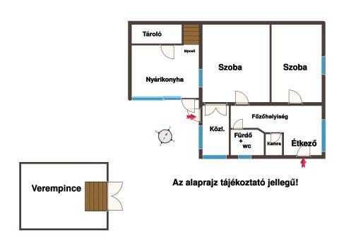 A ház elosztása: 2 szoba, konyha, étkező, fürdőszoba. Fűtését jelenleg egy szépen megépített kemence adja. Víz, villany, csatorna, bevezetve a házba, gáz a telek előtt húzódik.