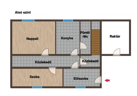 alsó szinten- nappali+ 1 szoba+konyha étkező+ fürdő-Wc+külső raktár