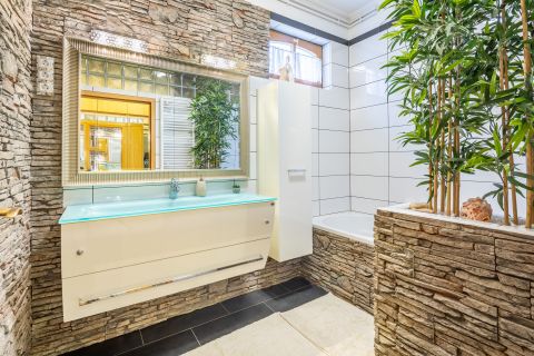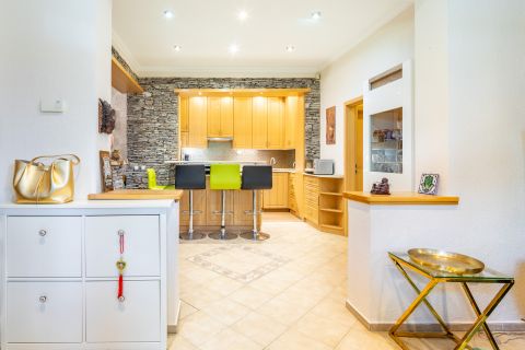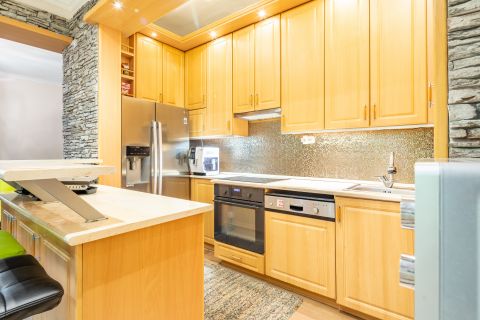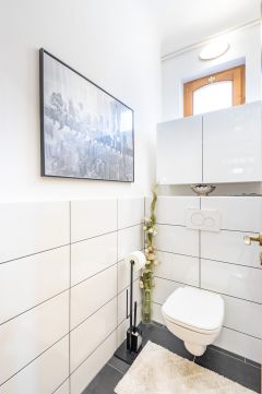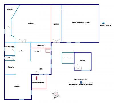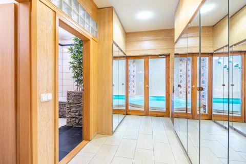 A konyha mellett amerikai konyha bárpulttal , onnan jobbra a tágas közlekedőből nyílik egy külön toalett és egy fürdőszoba továbbá az épületen belül található medencét is itt találjuk. A medencetérből akár a teraszra is kijuthatunk. A medencetér az ablakaival és enteriőrével magával ragadó.