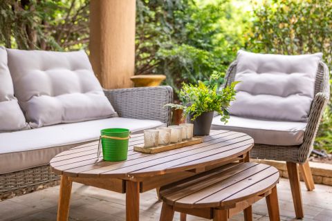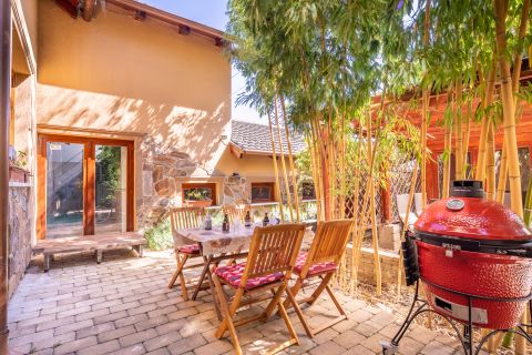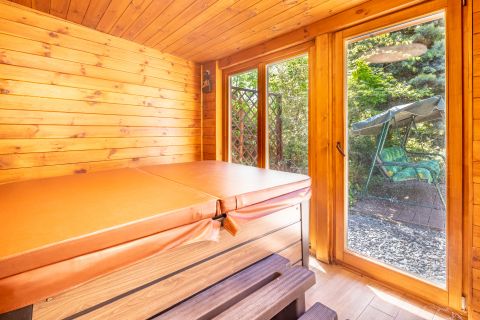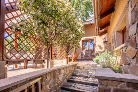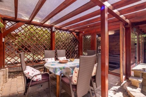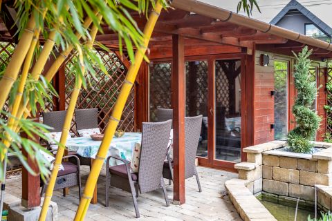 A kerti fedett teraszról nyílik egy külön épületben a jakuzzi közvetlen a hangulatos tavacska mellett, ahol a pihenés és kikapcsolódás garantált.