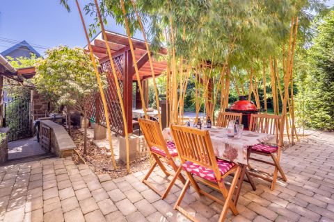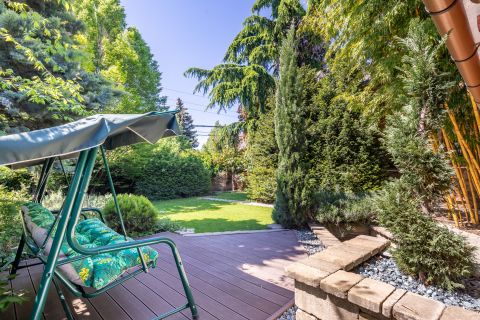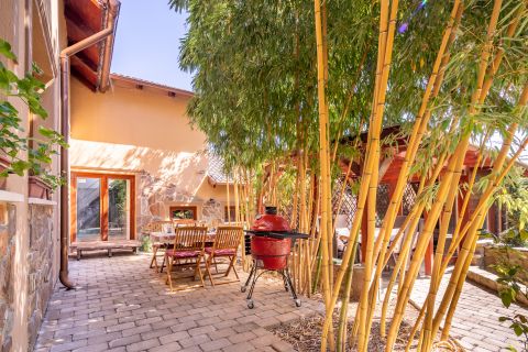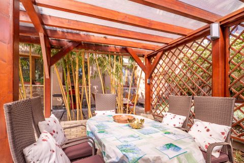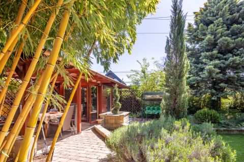 A kert gondosan kialakított, bambusszal beültetett, így nyugodt, zöld környezetben élvezheti az otthon melegét. Az ingatlanhoz dupla garázs is tartozik, amely kényelmes parkolást biztosít.