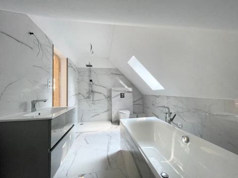 Emelet: nappali, 2 hálószoba, fürdő káddal és zuhanyzóval elegáns, világos terek
