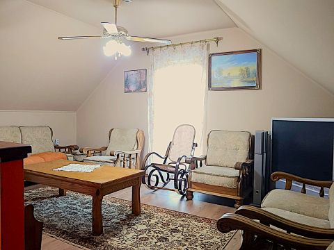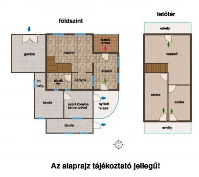 Az épület földszintjén tágas nappali, étkező, konyha és fürdőszoba található, a tetőtérben 2 db erkélykapcsolatos hálószoba és egy szintén erkélykapcsolatos nappali lett kialakítva. A házhoz fedett terasz, valamint sok tárolási lehetőséget biztosító helyiségek, nyári konyha kemencével, garázs, valamint sütögetésre és vendéglátásra alkalmas kerti, fedett melléképületek csatlakoznak.