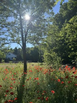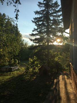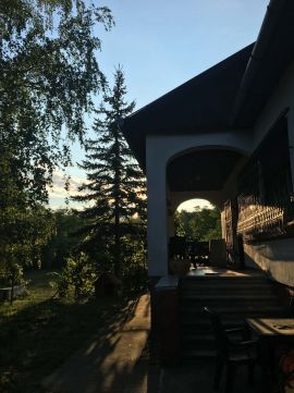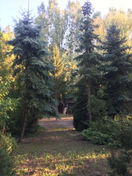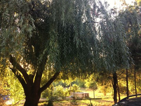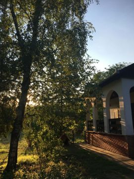 Fenyőfa, tuják és fűzfa ékesíti az udvart. Öntözési rendszert fúrt kút biztosítja.