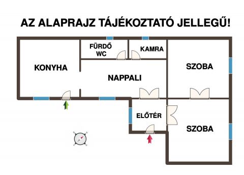 Helyiségeket tekintve kialakításra került 2 darab hálószoba, nappali, konyha étkezővel, fürdő WC-vel, kamra és egy előszoba.