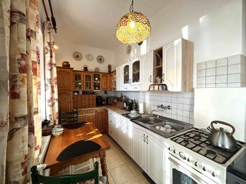 A nappaliból megközelíthető egy kényelmes fa lépcsőn az emelet, ahol kettő darab hálószoba került kialakításra illetve egy közlekedő. Az utcafronti szobából nyílik egy kényelmes méretű erkély, ahonnan kilátás nyílik a Duna partra.