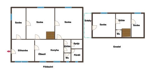 A földszinten található 3 szoba, előszoba, étkező-konyha, spájz, fürdőszoba, wc, közlekedő.