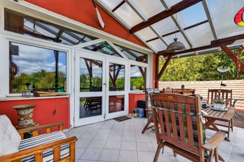 nagyméretű, fedett terasz közvetlen dunai panorámával