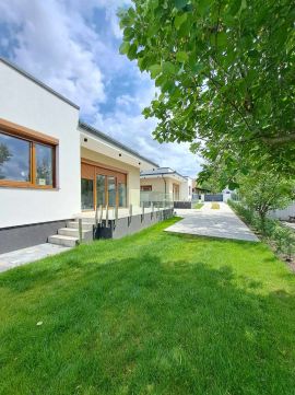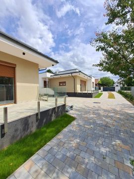 Egy telken lévő 2 db önálló földszintes, modern, lapostetős prémium anyagokkal és műszaki megoldásokkal készült 2 db új lakóház,hőszivattyúval készített melegvízzel és padlófűtéssel, klímával és 'H' tarifával ellátott lakóépület. Kertvárosi, családi házakkal körbevett, csendes zöldövezet.
