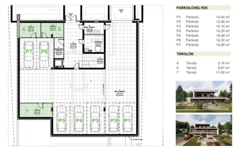 Mélygarázs 7 autó számára, 3 tároló és gépészeti helyiség