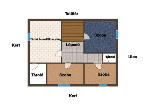 Az emeleten 3 kisebb hálószoba , zuhanyzóval ellátott fürdőszoba és két tároló található , ami praktikus lehet akár a háztartási eszközök tárolására , vagy gardrób kialakítása céljából .