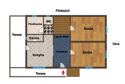 Az ingatlan földszinti részén a két tágas utcára néző hálószoba mellett, egy kádas fürdőszoba , különálló mellékhelyiség és egy fedett terasszal kapcsolatos konyha és kamra kapott helyett .