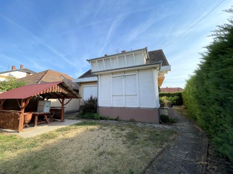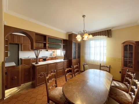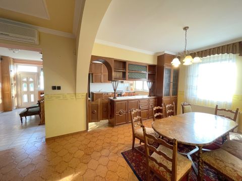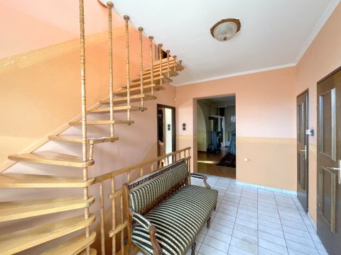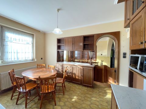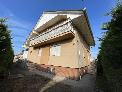 A főépület 1985-ben épült épült tégla falazatú, szigetelt. Az alsó szinten lévő az előtérből lehet az emeletre és a pincébe jutni. Ezen szinten helyet kapott egy tusoló, külön bejáratú wc és gardrób, tágas konyha beépített konyhabútorral és hozzá kapcsolódó kamrával valamint egy nagyméretű nappali - étkező rész és egy szoba ami a kertből is megközelíthető. Az emeleti részen további 3 szoba található saját gardróbrészekkel valamint fürdő és külön wc. A lakóház alatt található kb 30 nm-es pincében kapott helyet a gázkazán amely a ház fűtéséről gondoskodik, valamint tárolásra alkalmas helyiségek kerültek kialakításra.