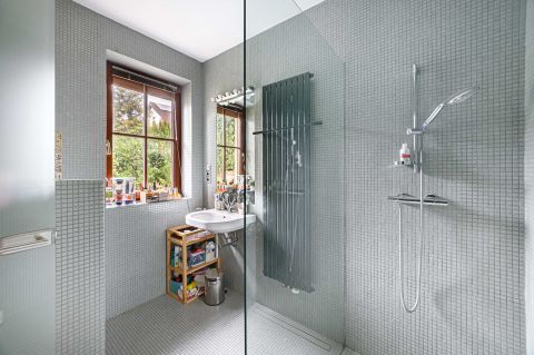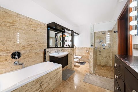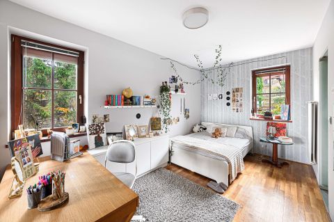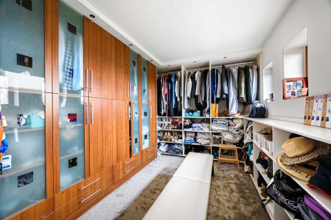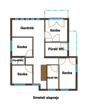 A felső szinten négy hálószoba, három fürdőszoba és egy külön gardróbszoba kapott helyet, így a család minden tagja számára biztosított a saját, kényelmes tér.