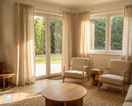 A házat a nap körberagyogja ezáltal a nap minden szakában élvezheti, valamennyi helyiségben vagy a teraszon a napfény sugarait.