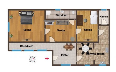 Helyiségei: 2 szoba, nappali, spájz, konyha, étkező, előszoba, fürdőszoba került kialakításra.