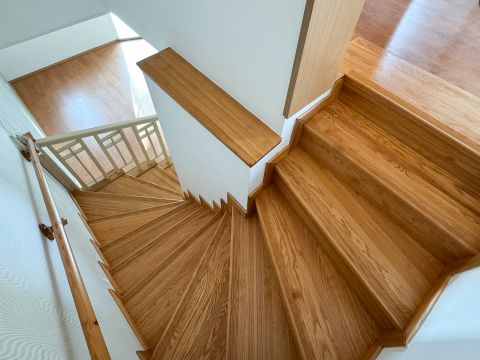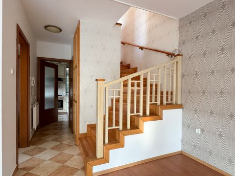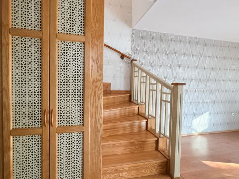 Földszint: Megnagyobbított előtér, tágas nappali (étkező kialakítási lehetőséggel), külön konyha víztisztítóval, elegáns, tömörfa burkolatú lépcső.